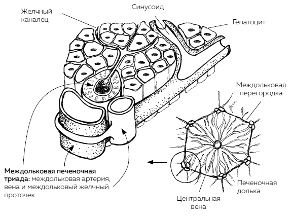 Печень представляет собой густую сеть из гепатоцитов, кровеносных сосудов и мелких желчных протоков. Такое строение обеспечивает огромную поверхность, где каждая клетка контактирует с кровью, и это обеспечивает максимальный обмен веществами между клеткой и кровью, чтобы контролировать ее состав.