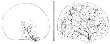 При синдроме Алажиля (левая часть рисунка) билиарное дерево плохо развито и имеет вдвое меньше протоков, присутствующих в здоровой печени, которая обычно показывает хорошо развитое билиарное дерево (правая часть рисунка).