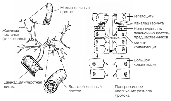 На поверхности отдельных гепатоцитов находятся борозды, которые вместе с подобными бороздами соседних клеток образуют тончайшие каналы (диаметром около 1 мкм) – желчные капилляры, или желчные проточки. Именно здесь зарождается желчь. Собственной стенки желчные капилляры не имеют, они заканчиваются в центральных отделах дольки, а на периферии образуют междольковые желчные проточки, выстланные холангиоцитами. Последние переходят в сегментарные, секторальные, долевые (правый и левый печеночный) протоки и, наконец, в общий печеночный проток – холедох, который выходит в просвет тонкой кишки. Именно так выглядит билиарное дерево. Самый простой метод его визуализации – это МРТ в режиме холангиографии (МРХПГ – МР-холангиопанкреатография).