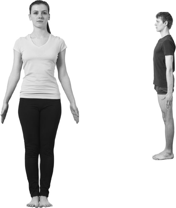 В положении стоя соедините стопы. Распределите вес между пятками и передней частью обеих стоп. Соедините (или сблизьте) внутреннюю поверхность ног. Вытяните ноги в коленях. Для этого подтяните коленные чашечки вверх мышцей переднего бедра, затем направьте плоть переднего бедра и колени назад. Поднимите грудную клетку вверх и расправьте ее в стороны от центра груди. Опустите плечи и лопатки. Вытяните руки вдоль туловища, отводя внешнюю часть плеч назад и разворачивая ладони к бокам туловища. Не напрягайте шею и голову. Смотрите прямо перед собой. Дышите спокойно. Останьтесь в позе 20–30 секунд.