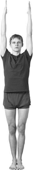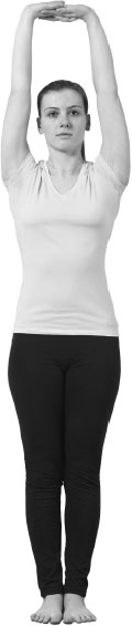 Встаньте в Тадасану. Вытяните руки перед собой. Переплетите пальцы рук в замок. Выверните ладони наружу. Со вдохом вытяните руки вверх так, чтобы они оказались в одной плоскости с головой, туловищем и ногами. Держите руки вытянутыми в локтях. Не поднимайте плечи. Не напрягайте шею и голову. Смотрите прямо перед собой. Дышите спокойно. Останьтесь в позе 20–30 секунд. На выдохе опустите руки вниз. Расплетите пальцы рук. Вытяните руки вдоль туловища. Сделайте несколько дыханий. Снова вытяните руки перед собой и поменяйте переплетение пальцев рук (если сверху был правый указательный палец, пусть теперь сверху окажется левый). Поднимите руки вверх и останьтесь в позе еще 20–30 секунд. На выдохе опустите руки. Вернитесь в Тадасану.