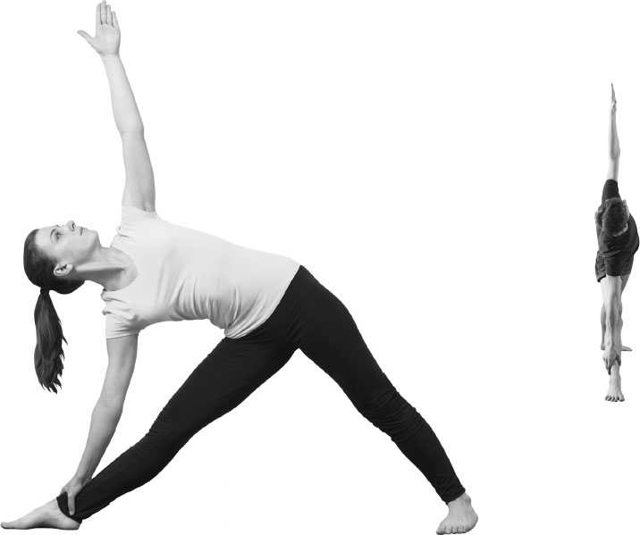 Из Тадасаны со вдохом прыжком расставьте стопы в стороны на 1,1–1,2 м, вытяните руки. Поверните левую стопу внутрь на 60°, все туловище и всю правую ногу разверните наружу вправо. На выдохе вытяните левую руку вперед и поставьте пальцы левой руки с внешней стороны правой стопы. Верхнюю правую руку разверните ладонью вперед. Со вдохом разверните шею и голову и смотрите на большой палец верхней руки. Держите ноги, туловище, руки, шею и голову в одной плоскости. Останьтесь в позе 20–30 секунд. Дышите спокойно. Со вдохом поднимитесь и выполните позу влево. Поднимитесь на вдохе, поставьте стопы параллельно друг другу. Опустите руки до положения параллельно полу и на выдохе прыжком вернитесь в Тадасану.