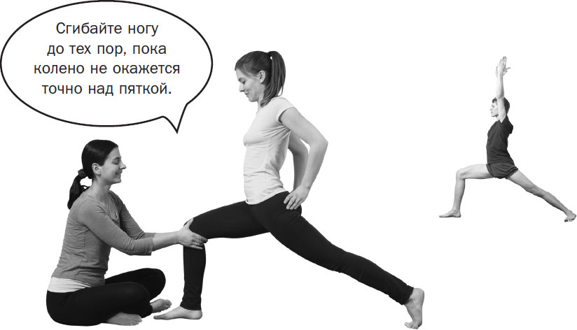 • Если задняя пятка отрывается от пола, поднимите пятку и полностью разверните всю заднюю ногу вперед. Это положение помогает при напряжении в нижней части спины.