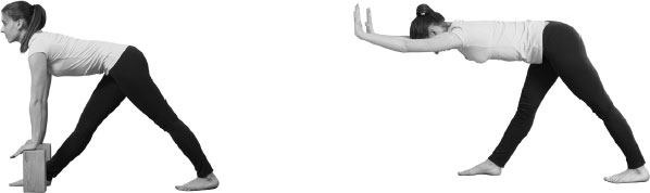 • Чтобы научить ноги и туловище правильно работать при наклонах вперед, делайте позу, опираясь ладонями о стену. Важно разворачиваться в сторону передней ноги от области таза, а не от талии. Позвоночник и бока туловища максимально вытягивайте в одну линию с руками. Передняя часть туловища и спина должны быть параллельны друг другу – немного втягивайте область поясницы, если она торчит вверх, и, наоборот, приподнимайте боковые части талии от пола, если поясница прогнута и «падает».