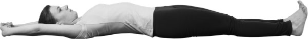 Лягте на спину. Соедините внутреннюю поверхность ног и стоп. Раскройте стопы, удаляя внутренние края стоп от туловища и натягивая внешние края стоп и все пальцы ног на себя. Старайтесь не разводить большие пальцы ног и пятки. Переплетите пальцы рук в замок, выверните ладони и вытяните руки за головой. Прижмите к полу запястья и вытяните руки, ноги и туловище. Держите живот, шею и голову расслабленными. Взгляд, не напрягая глаза, опускайте вниз. Дышите спокойно. Останьтесь в позе 30 секунд – 1 минуту. На выдохе расслабьтесь, отпустите руки и вытяните их вдоль туловища, ладонями к потолку. Затем поменяйте переплетение пальцев рук и выполните позу еще раз.
