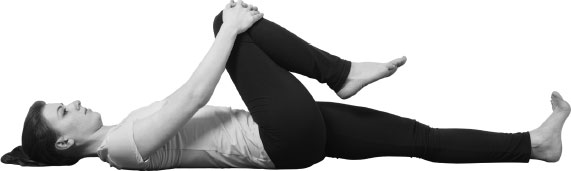 Лягте на спину. Соедините и вытяните ноги. Согните правую ногу в колене и приблизьте колено к груди. Переплетите пальцы рук в замок на верхней части правой голени и расслабьте правую ногу. Левую ногу сохраняйте вытянутой. Удерживайте правую и левую части крестца равномерно прижатыми к полу. Взгляд, не напрягая глаза, опустите вниз. Дышите спокойно. Останьтесь в позе 30 секунд – 1 минуту. Затем освободите правую ногу. Вытяните обе ноги. Выполните позу, сгибая левую ногу и меняя переплетение пальцев рук.