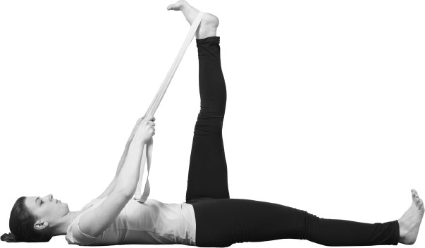 Лягте на спину. Соедините внутреннюю поверхность ног и стоп. Вытяните ноги. Согните правую ногу в колене и накиньте ремень на правую стопу (либо на границу между пяткой и сводом стопы, либо на подушечки под пальцами ноги). Распрямите ногу перпендикулярно полу. Разведите локти в стороны от центра туловища, опустите плечи к полу. Хорошо вытяните левую ногу на полу и правую ногу в пространстве. Держите правую и левую половины спины на полу. Сохраняйте живот, шею и голову расслабленными. Взгляд, не напрягая глаза, опускайте вниз. Дышите спокойно. Останьтесь в позе 30 секунд – 1 минуту. На выдохе отпустите правую ногу. Вытяните обе ноги. Затем выполните позу, поднимая левую ногу вверх.
