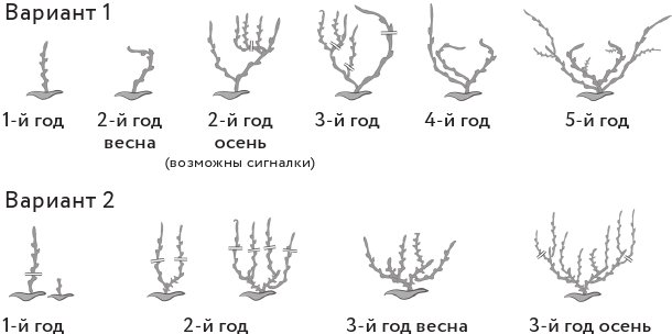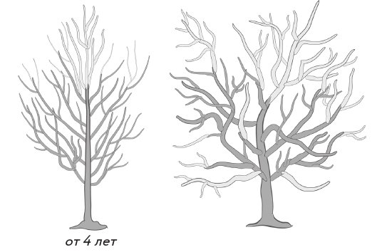 Проведите прореживание, удалив сухие, голые и мешающие ветки. На 2–3‐й год роста оставьте 5 скелетных побегов. Ежегодно проводите санитарную обрезку