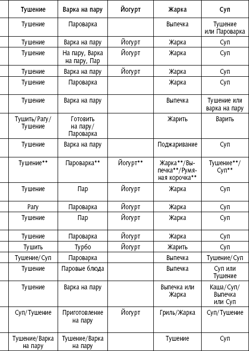 Но если у вас другая мультиварка, то достаточно взглянуть в таблицу 2, чтобы понять, какой режим приготовления вам нужно выбрать. Или почитать описание режимов выше (таблица 1).