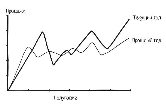 Базовую модель графика с двумя осями координат для представления различных форм собранных данных можно использовать по-разному. Линией графика обычно отображается траектория множества собранных данных (объем продаж по оси x, недели месяца по оси y), и обычно она имеет вид линии, отображаемой слева направо. По тем же осям другими цветами можно для контекста отложить данные за прошлые годы (может быть, чтобы представить текущие цифры в лучшем свете или обосновать их).