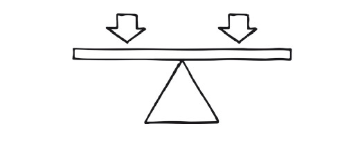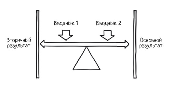 В некоторых случаях соединительный эффект образуется уже за счет расположения разных элементов рядом (как на диаграмме ниже, где некая форма визуализации представлена в виде «качелей»-балансира для вводной информации, к которым можно добавлять составляющие в виде дополнительных вертикальных шкал). В этом примере визуализация представлена с помощью качелей-весов и вертикальной шкалы (или шкал).