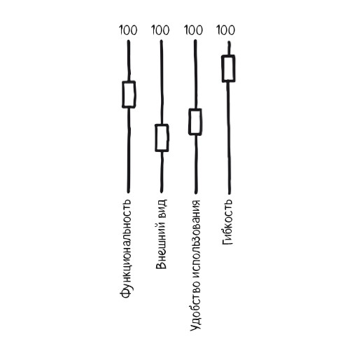Для обозначения меняющихся вводных могут также использоваться регуляторы (показанные в виде круглой шкалы или бегунков). На панели бегунков можно показать сначала один набор уровней или вводных, а затем отредактировать картинку с другим набором значений. Влияние возможных изменений вводных можно разбирать и с одним рисунком – сдвиги параметров можно отобразить через движение рук с расчетом, что читатели в уме визуализируют предлагаемое изменение.