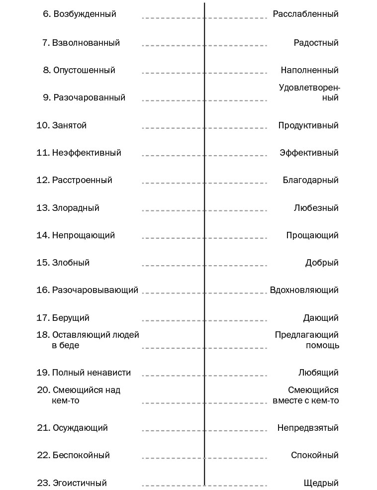 Какими вы обычно видите мир и людей вокруг вас? Возьмите листок бумаги и выпишите в столбик числа от 1 до 40. Оцените людей из вашего окружения по предложенным парам признаков. Вы можете поставить каждому признаку оценку от единицы до пятерки. Если хотите, сделайте это упражнение отдельно для родственников, коллег и друзей.