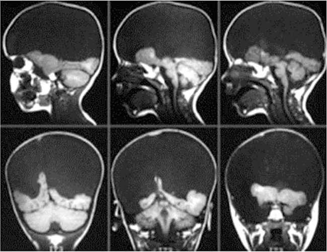 Рис. 4. Снимок мозга трехлетней девочки с врожденным отсутствием коры. Большая темная область внутри черепа – это место, которое должна была занимать отсутствующая ткань