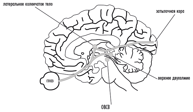 Рис. 6. Здесь показано расположение верхнего двухолмия и затылочной коры, а также их связи с глазами. Аналогичные связи существуют и для других сенсорных модальностей. Отмечено также околоводопроводное серое вещество (ОВСВ), о котором я пока не рассказывал, но о его значении мы вскоре поговорим