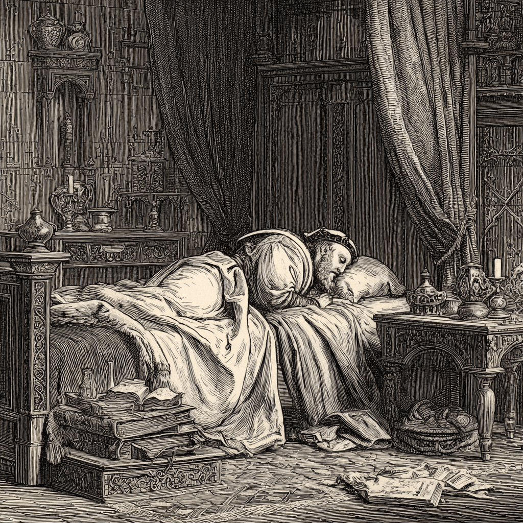Тут голос его прервался; смертельная бледность покрыла лицо. Придворные бросились поправлять подушки и приводить больного в чувство.