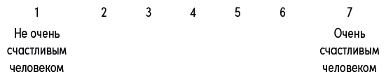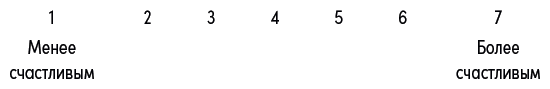 H (устойчивый уровень счастья)Важно различать мимолетное счастье и ваш устойчивый уровень счастья. Кратковременное чувство радости можно легко получить от множества приятных мелочей вроде шоколада, комедийного фильма, массажа спины, комплимента, цветов или новой блузки. Эта глава, как и книга в целом, не является руководством по увеличению количества счастливых мгновений в вашей жизни. Никто лучше вас не знает, как это сделать. Задача состоит в том, чтобы поднять устойчивый уровень счастья, а простое увеличение числа счастливых мгновений не приблизит вас к этой цели (по причинам, о которых вы скоро узнаете). Шкала Фордайса, которой вы пользовались в предыдущей главе, предназначалась для оценки мимолетного счастья, теперь же нам нужно измерить общий уровень счастья. Шкалу для этого разработала Соня Любомирски, доцент психологии Калифорнийского университета в Риверсайде[42]42