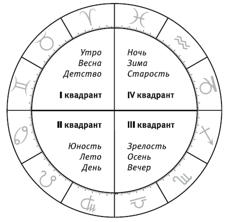 Зодиак – это цикл человеческой жизни. Он начинается с Овна (появление на свет, осознание себя) и завершается в Рыбах (растворение во вселенной). В этой связи зодиак делится на четыре квадранта (рис. 5). Каждый связан с одной из фаз человеческой жизни. Наиболее заполненные планетами квадранты указывают на особую значимость для человека этих фаз жизни.