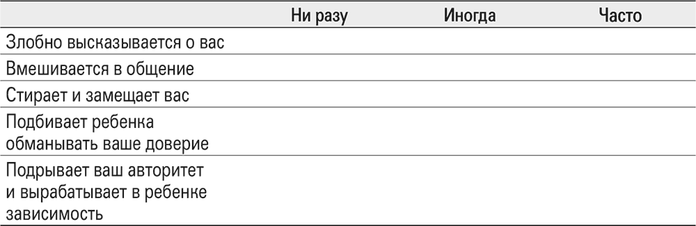 Подбивая ребенка обманывать ваше доверие, бывший понуждает его таиться от вас и потихоньку следить за вами. Такой надзор может включать в себя отслеживание того, сколько вы тратите, с кем говорите по телефону и сколько денег зарабатываете. Скорее всего, чтобы заставить ребенка выполнять свои требования, ваш бывший использует увещевание и лесть, давая понять, насколько доверяет ему. Ребенок оправдывает свое предательство, очерняя вас, а в результате в его душе укореняются негативные чувства к вам. Как реагировать на то, что бывший подбивает ребенка обманывать ваше доверие, мы обсудим в главе 8.