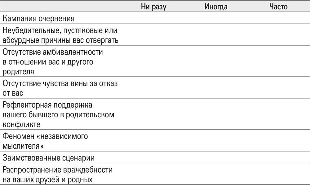 Один отец позвонил мне (Эми), чтобы обсудить свои опасения по поводу маленькой дочери, оказавшейся в конфликте лояльности между ним и его бывшей. Дочь пришла к нему в гости в субботу утром и взволнованно рассказала о новом художественном проекте, над которым они с матерью работали накануне вечером: составляли ежемесячный календарь на оставшуюся часть года. И призналась, что те дни, когда она с мамой, для нее полны блесток, радуг и единорогов, обозначающих солнце и радость. «А те дни, когда ты со мной?» – спросил он. – «О, – сказала она, – они совершенно пустые». К этому моменту у отца в голосе уже звучали слезы. Он сказал, что после таких откровений дочери почувствовал себя пустым, словно незаполненные дни в ежедневнике. Фактически же признался, что, хоть сильно любит дочь и дорожит их совместным времяпровождением, к концу ее визита обычно выдыхается. Теперь его переполняли отчаяние и сожаление. Из дальнейшего разговора стало ясно, что отец позволил матери, пытающейся стереть его из дочкиной души, добиться своего. Недостаток сил и внимания к девочке показал ей, что мама была права: время с папой – пустое. Таким образом, он невольно увеличил дистанцию между собой и дочерью и разочарование в нем.