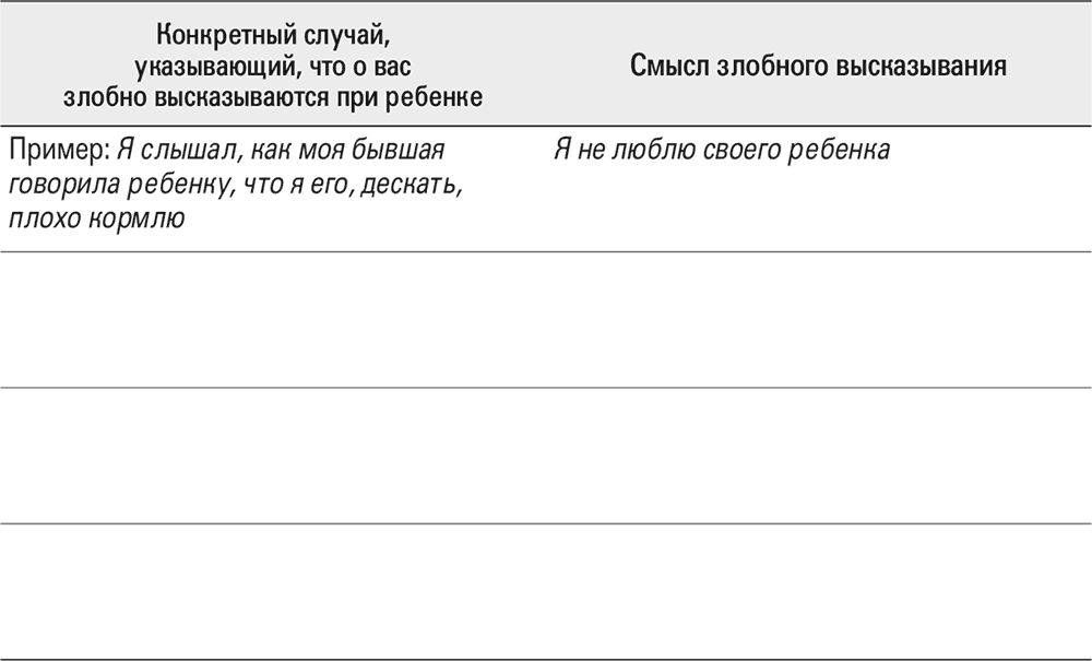 В первом столбце приведенной ниже таблицы запишите слова или поступки вашего бывшего или ребенка, которые свидетельствуют о том, что бывший враждебно высказывался в ваш адрес. Во втором запишите, какой смысл, по-вашему, вкладывался в эти слова. Если у вас не один ребенок, упражнение можно выполнить для каждого, скачав или распечатав копию с сайта: http://www.newharbinger.com/29583.