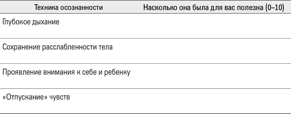 В течение следующих двух недель практикуйтесь в разных техниках осознанности, а затем заполните следующую таблицу, чтобы определить, какая из них оказалась наиболее полезной (оцените от 0 до 10).