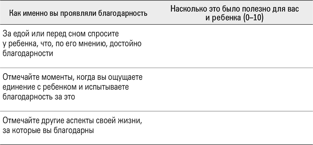 В течение следующих двух недель практикуйтесь в том, чтобы разными способами проявлять благодарность, а затем заполните следующую таблицу, чтобы по шкале от 0 до 10 определить, какой из способов оказался наиболее полезным. Если у вас не один ребенок, копии для всех детей можно скачать или распечатать с сайта: http://www.newharbinger.com/29583.