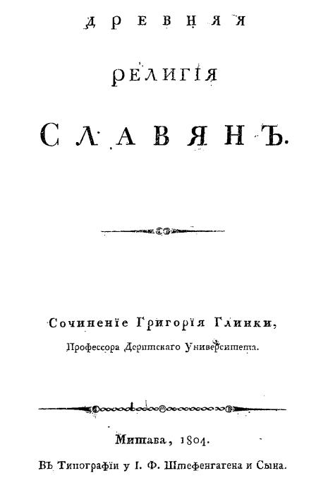 Титульный лист одной из наиболее известных русских книг о дохристианских верованиях славян, изданной в 1804 г. Григорием Андреевичем Глинкой (1774–1818). В книге широко использованы и те сведения о славянских божествах, которые сообщает Мавро Орбини