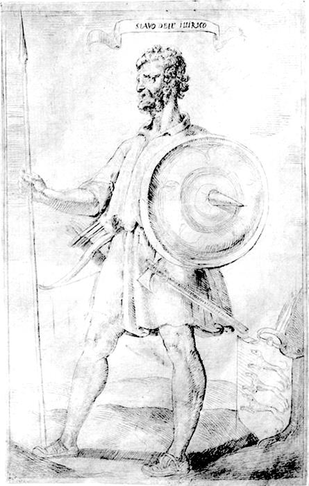 «Славянин Иллирический» (Slavo dell’ Illirico) – иллюстрация из итальянского оригинала книги Мавро Орбини. Этот образ для него и для других далматинских гуманистов имел особое значение, поскольку представлял идеализированного древнего воина собственного Отечества, героического предка южных славян