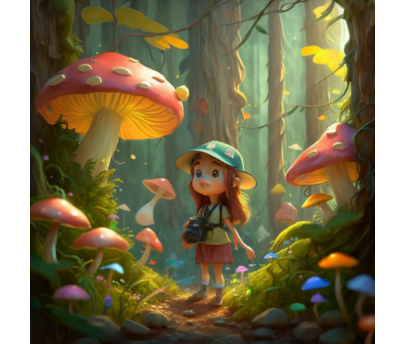 Глория и Скаут продолжили свое путешествие по лесу, наслаждаясь видами и звуками природы, они наткнулись на поляну, залитую пятнами солнечного света. В центре поляны стояла гроздь грибов, не похожих ни на какие, которые Глория когда-либо видела прежде. Эти грибы были не только большими, но и, казалось, излучали мягкое, неземное свечение, которое заливало окрестности теплым, потусторонним светом.