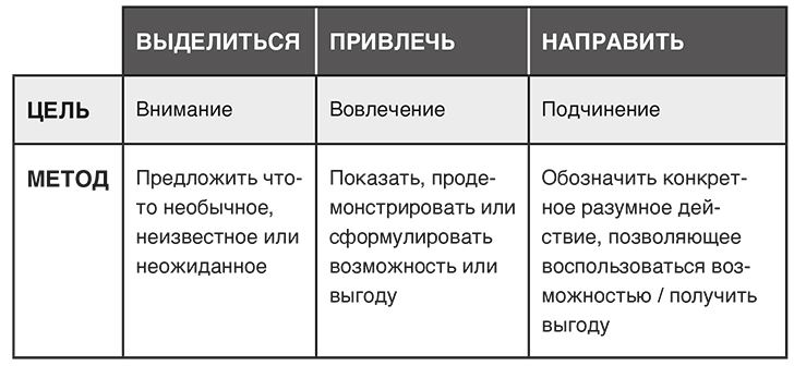 Ваша первая задача – выделиться из толпы. Предложите публике что-то иное, непохожее, чтобы на вас обратили внимание. Большинство пренебрегает этим правилом и просто пытается продемонстрировать рынку свое наиболее привлекательное предложение. Но даже самое прекрасное и великолепное предложение на свете никого не заинтересует, если никто его не заметит. Выделившись, переходите к следующему этапу: сделайте свой товар или услугу привлекательными для своей ЦА. И завершите эту красивую хореографию инструкцией, побуждающей потенциального клиента к конкретному действию. Три шага, в одной и той же последовательности, раз за разом. В-П-Н. Всегда.