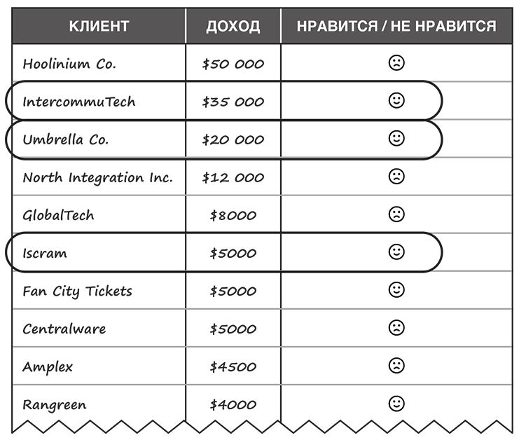 Теперь обведите 10 процентов клиентов из своего списка, которые приносят вам больше всего денег (вы нравитесь им больше других) и рядом с которыми стоят радостные смайлы (они тоже нравятся вам больше других). Нужно постараться, чтобы таких стало больше. Подумайте о каком-то конкретном высокодоходном клиенте. Теперь представьте, что десять его клонов заходят в ваш кабинет и выкладывают такую же сумму за ваши услуги. Ваши дела сразу бы пошли в гору, верно?