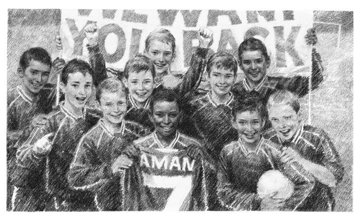 – Если пересчитаете игроков, – продолжал он, – увидите, что их десять человек. А должно быть одиннадцать. Не хватает меня. Вот это Марлон, центральный нападающий, двадцать семь голов за прошлый год, он как Руни, даже круче. А длинный, как жираф, – вон там, сзади, рядом с Мэттом, – это Флэт Стэнли, наш воротчик. Улыбается до ушей и большой палец показывает – видите?