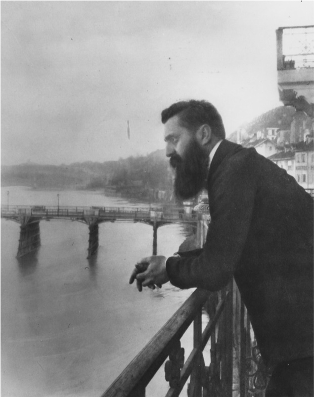 Илл. 1. Теодор Герцль создал в конце XIX века сионистское движение и организовал первый его съезд в 1897 году в Базеле (Швейцария). Эта фотография принадлежит художнику-сионисту Эфраиму Лилиену. Она стала каноническим образом Герцля. Здесь он смотрит на Рейн, но мысленно находится в Сионе