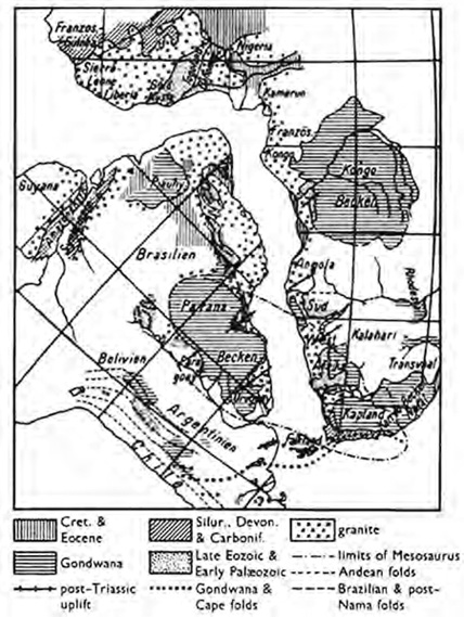 Рисунок 2.5. Карта из более позднего издания «Происхождения континентов и океанов» Вегенера, основанная на работе южноафриканского геолога Александра дю Туа, показывающая геологическую и палеонтологическую (мезозавр) преемственность на суше Южной Америки и Африки