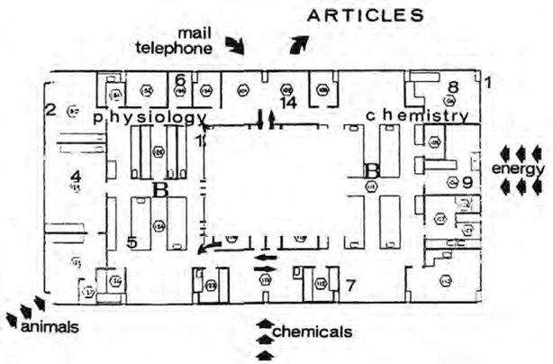 Латур провел два года в лабораториях Гиймена в Институте Солка в Сан-Диего и обнаружил там своего рода самовосполняющийся цикл бытия. В лабораторию Гиймена поступало огромное количество препаратов, лабораторных животных и энергии, которые поддерживали сложнейший физический и социальный процесс, в ходе которого составлялись научные отчеты посредством «устройств записи», функция которых заключалась в «преобразовании кусочков материи в письменные документы» (рис. 2.6). Эти документы, статьи, опубликованные в научных журналах, в свою очередь превращались в некий «кредит» – научную репутацию, которая представляет собой не столько самоцель, сколько некий ресурс, который может быть израсходован на приобретение новых препаратов, лабораторных животных и энергии, новые устройства для записи, а также оплату труда ученых и техников, следствием работы которых станут новые тома отчетов и накопление новых «кредитов». Научная лаборатория, как писал Латур и его коллега Стив Вулгар в книге «Лабораторная жизнь», – это не столько сложная техника, сколько некое подобие живого организма, и его главная задача – выживание и размножение.