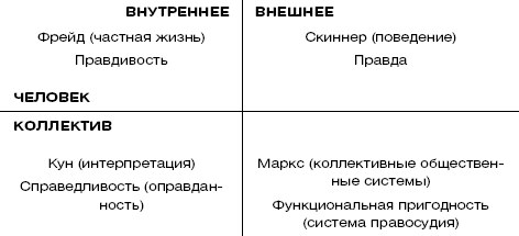 • З. Фрейд занимался внутренней (частной) жизнью человека (верхняя левая сторона), Б. Ф. Скиннер – поведением людей (верхняя правая). Т. Кун занимался тем, как общий фундаментальный контекст руководит интерпретацией (нижняя левая), а К. Маркс – коллективными общественными системами (нижняя правая).