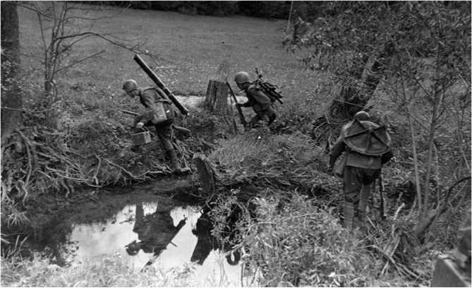 Минометный расчет, к-рым командует Х.А. Межмединов, меняет огневую позицию. Личный архив.