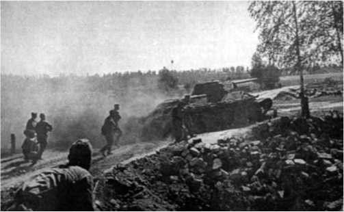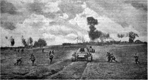 Танки в сопровождении пехоты наступают на пункт, занятый немцами. 28 августа 1942 г. «Правда».