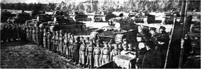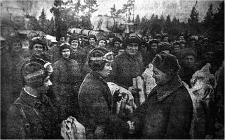 Митинг в гвардейской части, посвященный передаче колонны танков «КВ», построенных на средства сов. полярников. Выступает И.Д. Папанин. 10 ноября 1942 г. «Правда».
