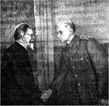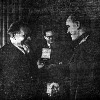 28.4.43 – Москва, Кремль – Предс. Президиума Верх. Совета СССР М.И. Калинин вручает орден Ленина командиру чехословацкой воинской части в СССР полковнику Л.Свободе.