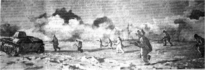 Автоматчики под прикрытием дымовой завесы идут в атаку. 13 февраля 1943 г. «Правда».