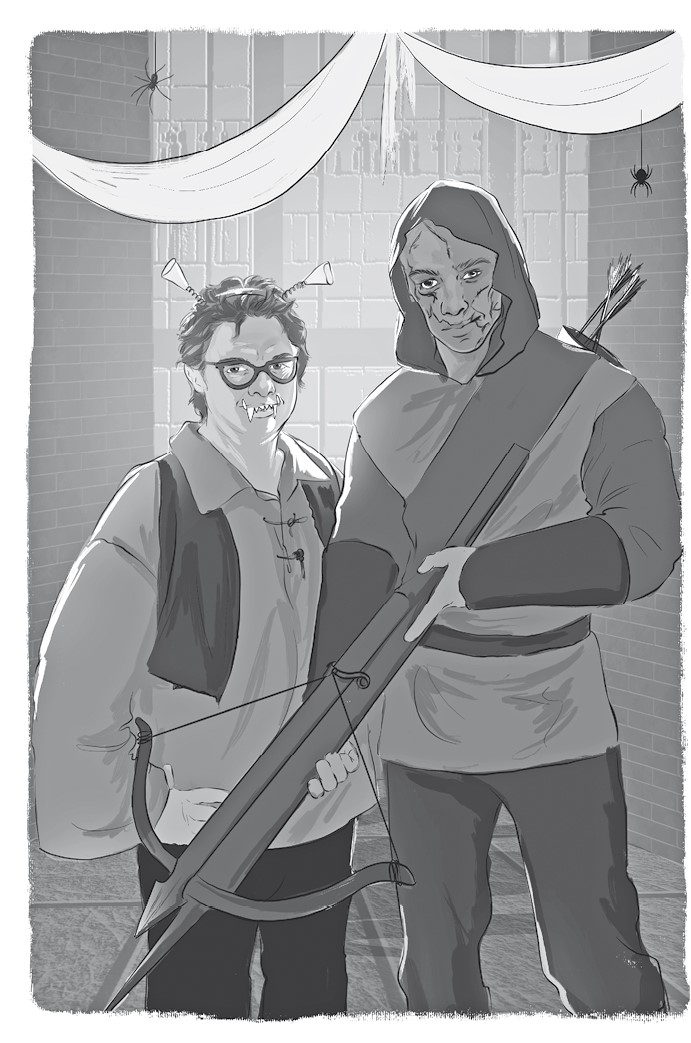 Он прохаживается по комнате, раскинув руки, кривая улыбка поперек лица, весьма гордый своим костюмом охотника за ограми. Он подошел к делу с большим старанием, соорудив себе арбалет из старой вешалки для курток, которую переделал, потратив килограммы полимерной глины.