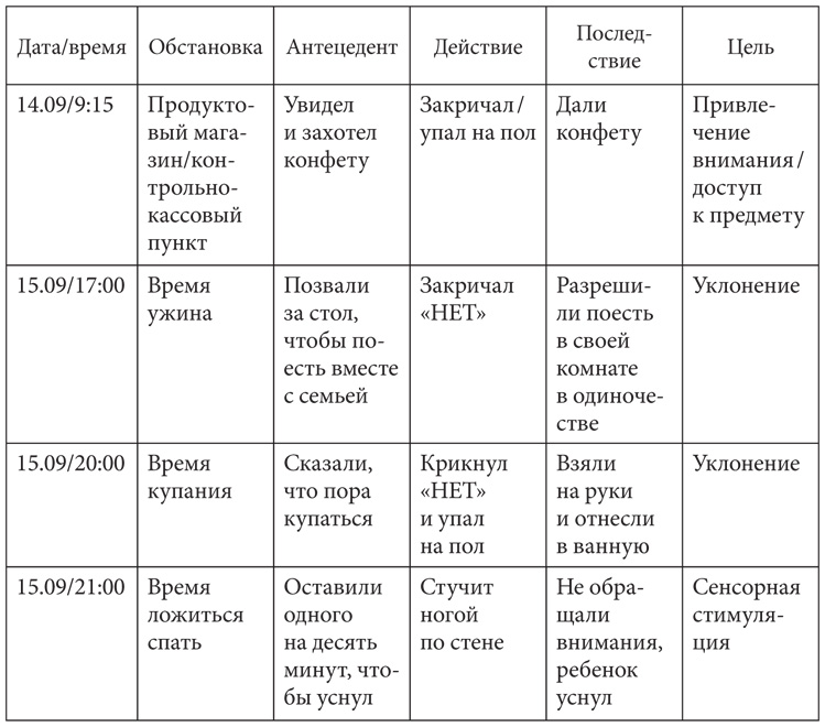 Каким бы странным это ни показалось вам поначалу, фиксация информации об антецедентах, действиях и последствиях поведения – лучший способ определить, что является «спусковым крючком» для действия и как ребенок использует это действие, чтобы получить вожделенный результат.