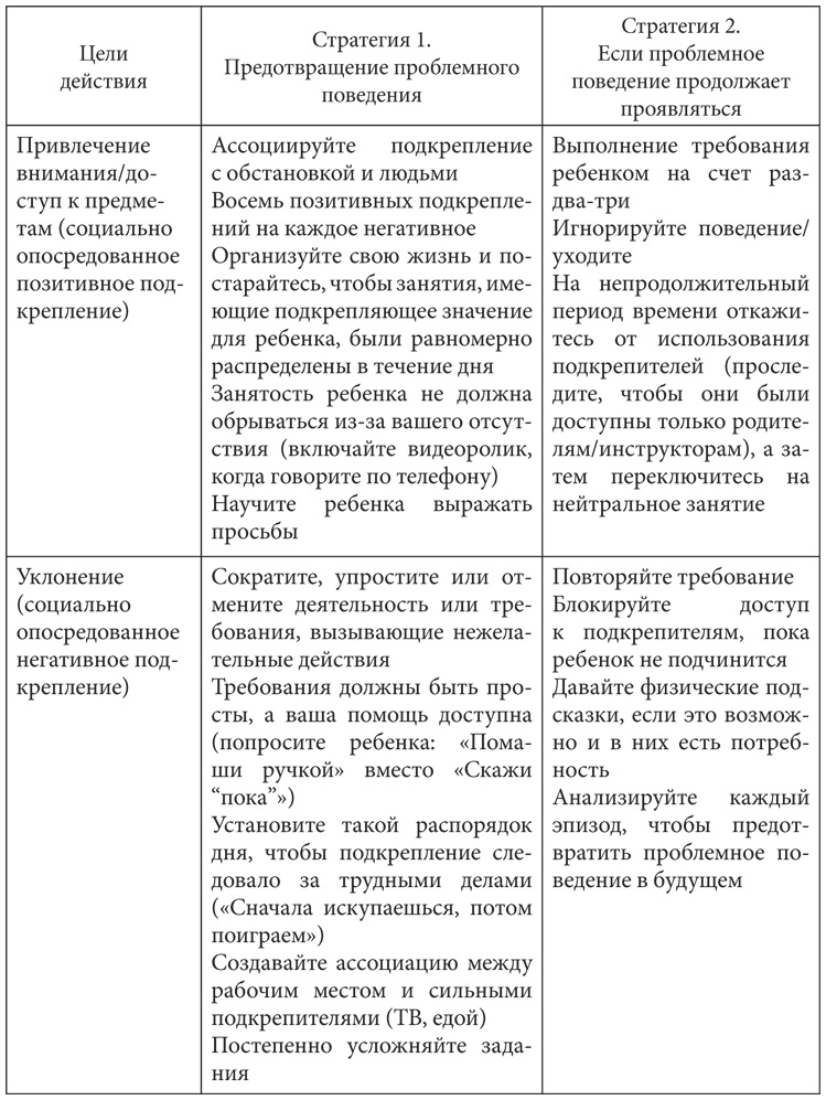 По сути, вам нужны всего лишь три стратегии, чтобы добиться улучшения поведения. Одна для всех типов поведения, направленных на привлечение внимания, одна для поведения, стремящегося к уклонению, и еще одна – для поведения, задачей которого является получение сенсорного удовлетворения.