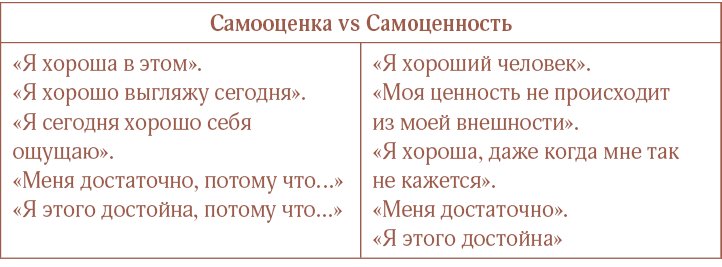 Самоценность возникает каждый раз, когда вы сталкиваетесь со словом «достаточно» в своем внутреннем диалоге. Может быть, вы готовитесь к свиданию и думаете: «Фу! Я недостаточно красива», потому что ваши волосы немного растрепались. Ваш ребенок закатывает истерику, и вы задаетесь вопросом: «Может, я недостаточно хороший родитель?» Вы достигли важной вехи в своей карьере, получив новую работу или повышение, и снова спрашиваете себя: «Достаточно ли я квалифицирована для этого? Действительно ли я этого заслуживаю?» А может, вы сбросили несколько килограммов, но все равно думаете: «Этого недостаточно. Мне нужно сбросить еще несколько, и тогда я буду довольна своим телом». Вы поссорились со своей второй половинкой и восприняли все сказанное им как «Ты недостаточно хороша!». Список можно продолжать до бесконечности, но всякий раз, ловя себя на мысли или ощущении «недостаточности», вы должны воспринимать ее как сигнал о проблеме с самоценностью.