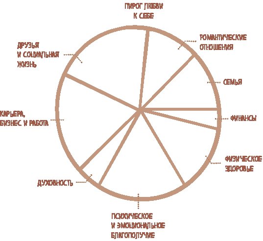 Прежде всего нужно помнить, что любовь к себе для всех выглядит по-разному. Я поясню эту мысль с помощью «пирога любви к себе», который «разрезан» на области жизни, где каждый нуждается в самоценности. Но сначала давайте разберемся с некоторыми распространенными заблуждениями о любви к себе, которые могут встать у вас на пути.