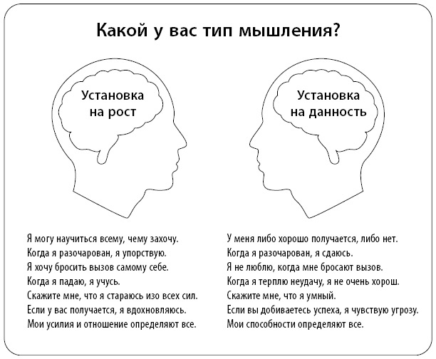 Что не так с этой иллюстрацией? Люди действительно могут различаться по типу мышления, но если иметь в виду исключительно способности, то данная схема свидетельствует: мышление – это то, что у нас в голове, что описывается дихотомией – или-или. И мы обязаны определить, какое у нас мышление, выбрав одно из двух. Вы видите в этом иронию? Когда мы говорим, что у нас либо установка на данность, либо на рост, то это очень фиксированный взгляд на мышление, не правда ли!