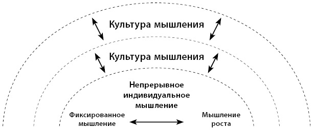 Организации не всегда и не в любых контекстах в полной мере воплощают в себе культуру гениев или культуру роста – то есть они не гомогенны. Организационное мышление непрерывно, как и личное. На уровне организации обычно существует узнаваемая превалирующая культура мышления (культурная установка), внутри которой часто можно рассмотреть различные микрокультуры мышления. Например, в целом организация может придерживаться фиксированного мышления, но некоторые подразделения, отделы или команды явно ориентированы на рост.