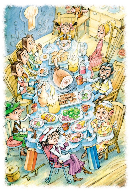 Потом, когда гости немного привели себя в порядок, все уселись ужинать. Ели в кухне, которая хоть и разочаровала Хомили, зато там горел настоящий огонь. Плитой служил большой чёрный дверной замок. Угли помешивали через замочную скважину, а дым, как объяснила Люпи, уходил через систему труб в дымоход коттеджа.